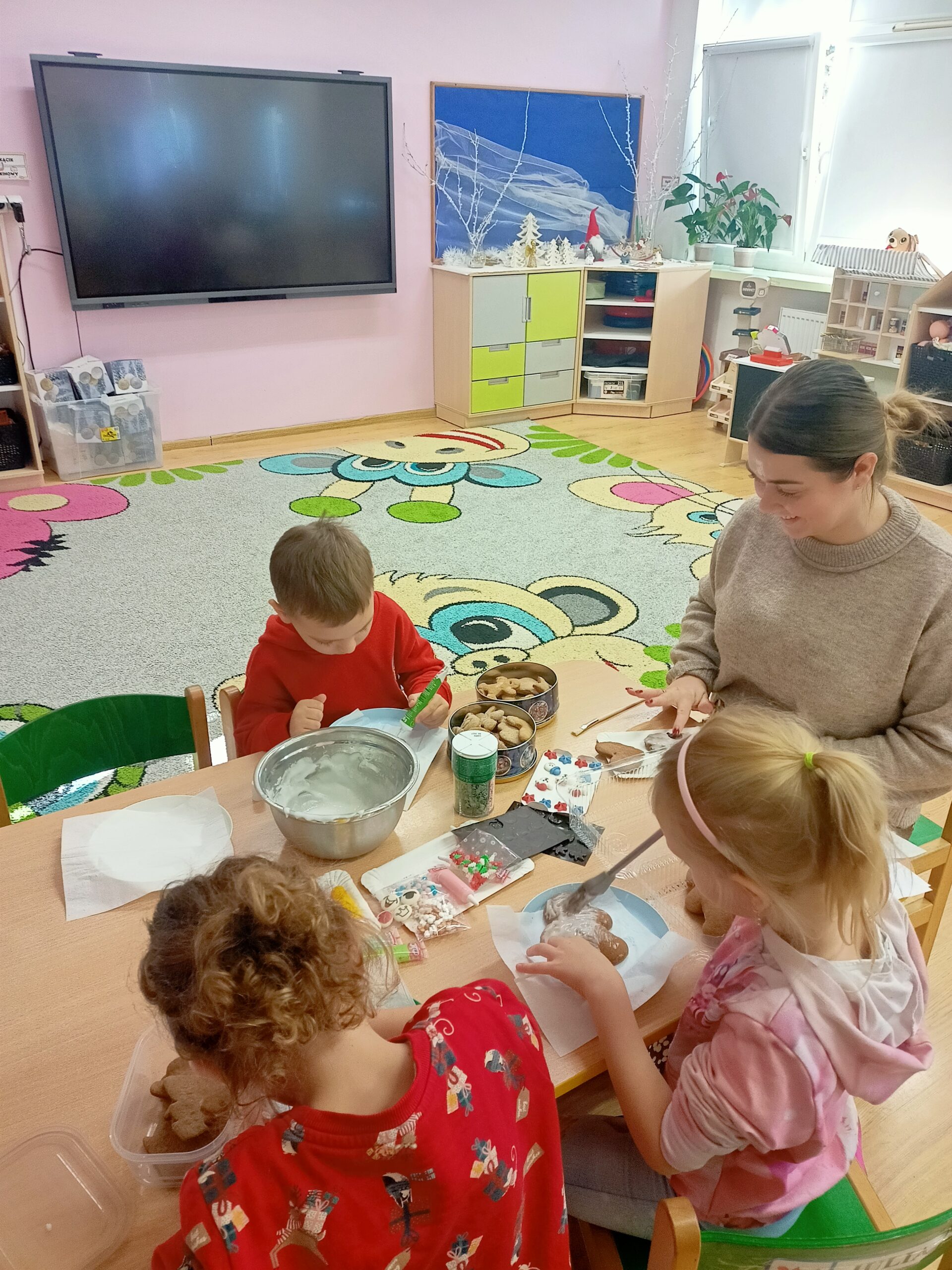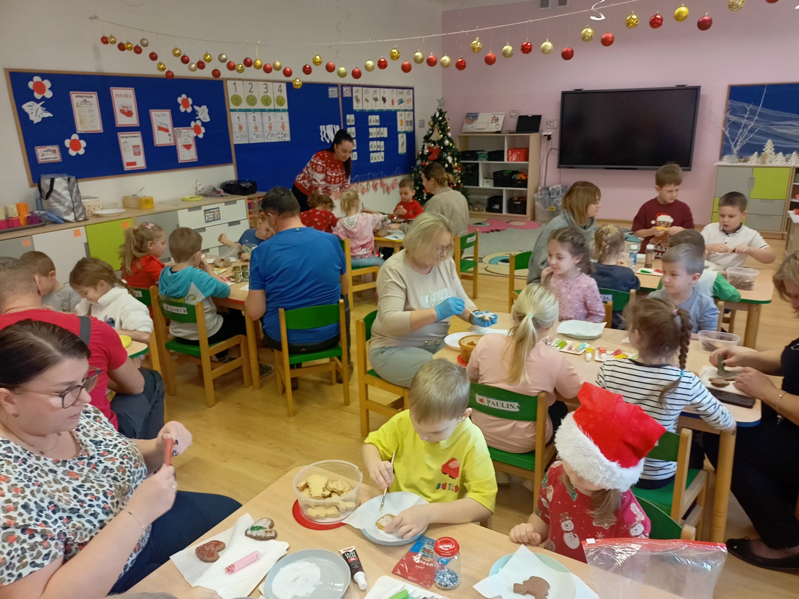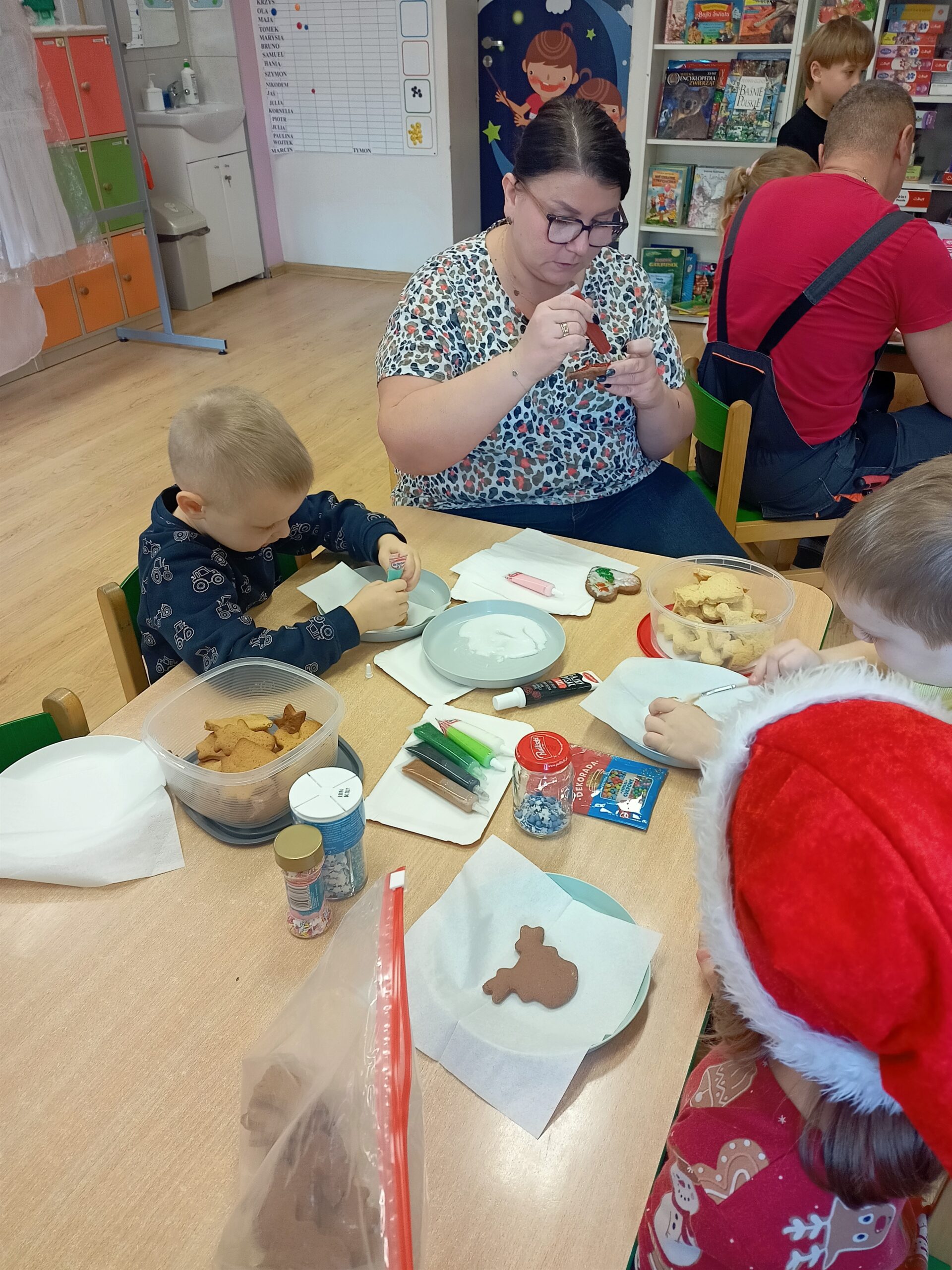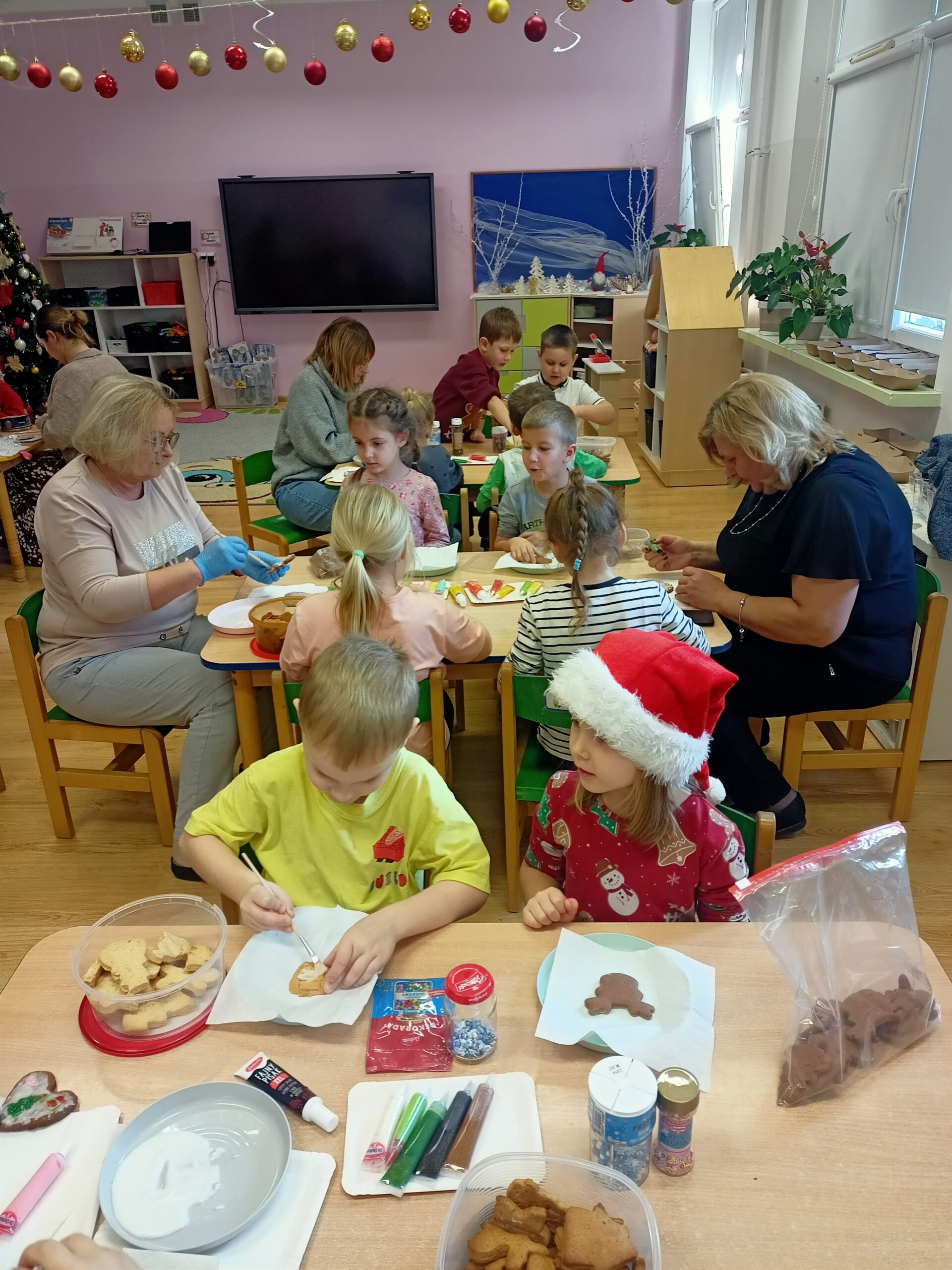 Na kilka dni przed Świętami Bożego Narodzenia dzieci z grupy ,,Odkrywców” zaprosiły pracowników naszej szkoły na warsztaty ozdabiania pierników, chcąc w ten sposób PODZIĘKOWAĆ za opiekę, wszelkie dobro jakiego doświadczają dzieci. Gościliśmy panią Elżbietę Frankiewicz, panią Danutę Przybylską, panią Karolinę Towściuk- Kwaśniewską, panią Ewę Wach, panią Małgorzatę Witułę, pana Jacka Klimowicza i pana Franciszka Panasika. Dzieci podpatrywały poczynania dorosłych i próbowały ich naśladować, by w końcu odwołać się do swojej dziecięcej wyobraźni i stworzyć swoje niepowtarzalne piernikowe dzieła. Było wspaniale, domowo, radośnie i świątecznie, wszędzie lał się kolorowy lukier, słychać było świąteczną muzykę.
