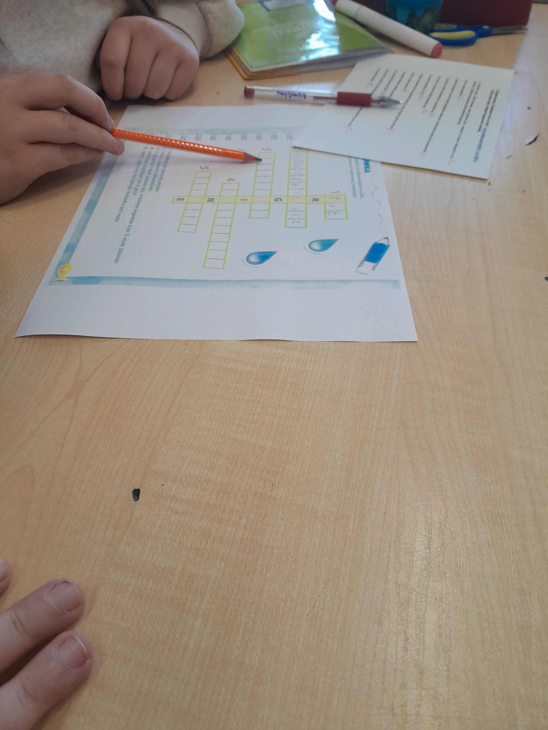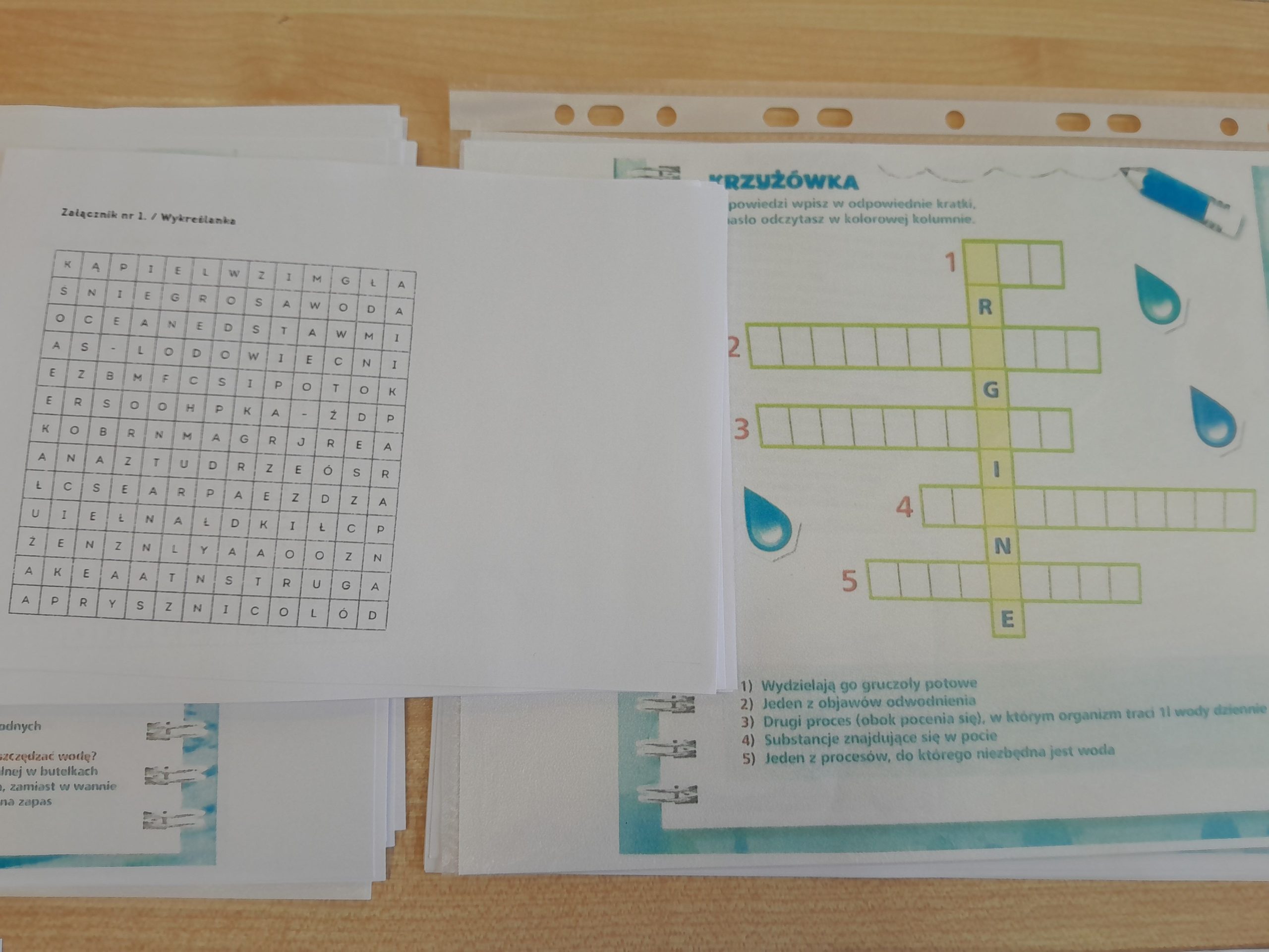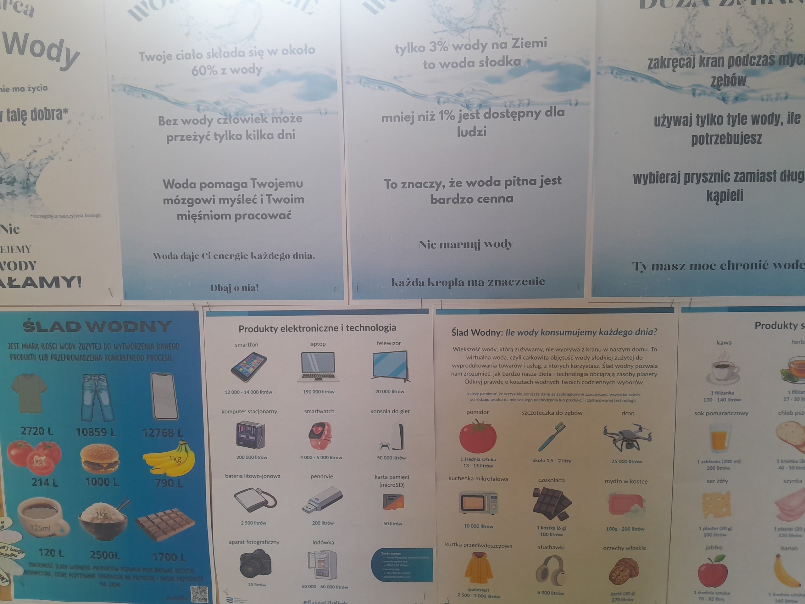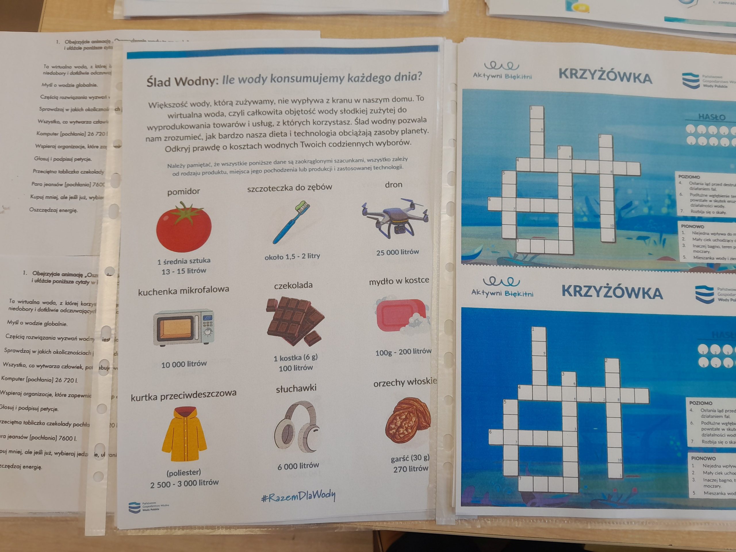 Uczniowie rozwiązywali także krzyżówki i rebusy związane z wodą, odkodowywali hasła tematyczne oraz sprawdzali swoją wiedzę, biorąc udział w quizach i testach. Podczas zajęć poznawali również praktyczne sposoby oszczędzania wody oraz dowiedzieli się, jak ich codzienne wybory wpływają na środowisko naturalne. Była to nie tylko ciekawa, ale i bardzo wartościowa lekcja odpowiedzialności za naszą planetę. W holu szkoły stanęła tablica z gazetką pt. Nie lejemy wody – oszczędzamy.