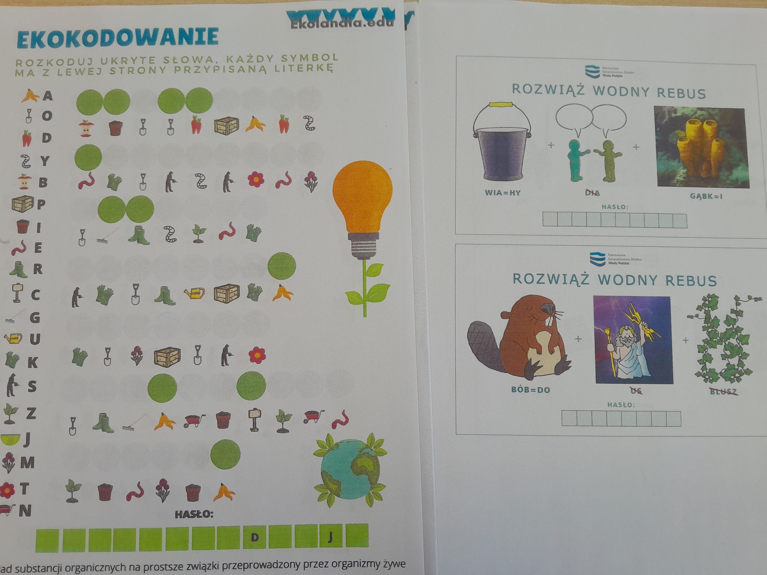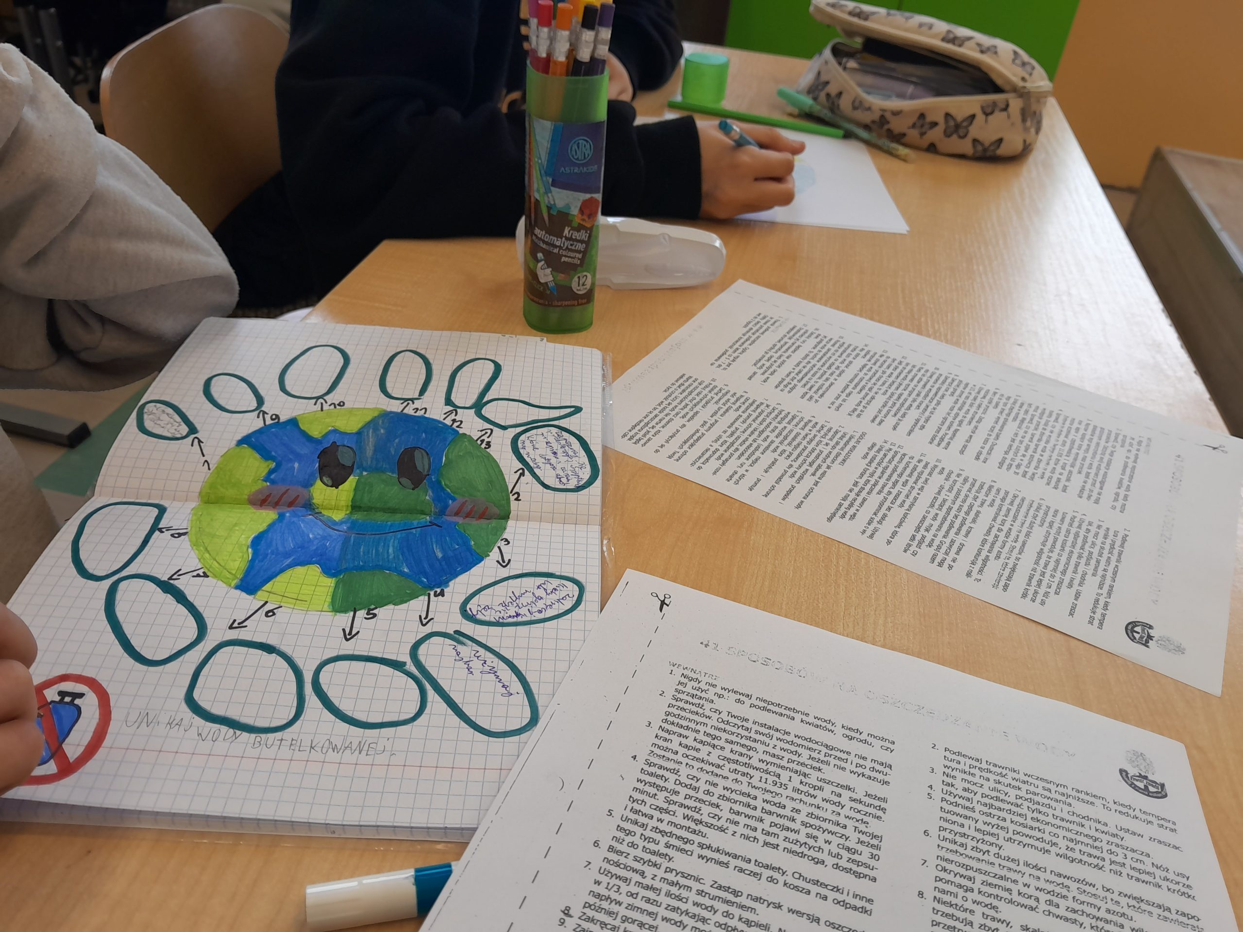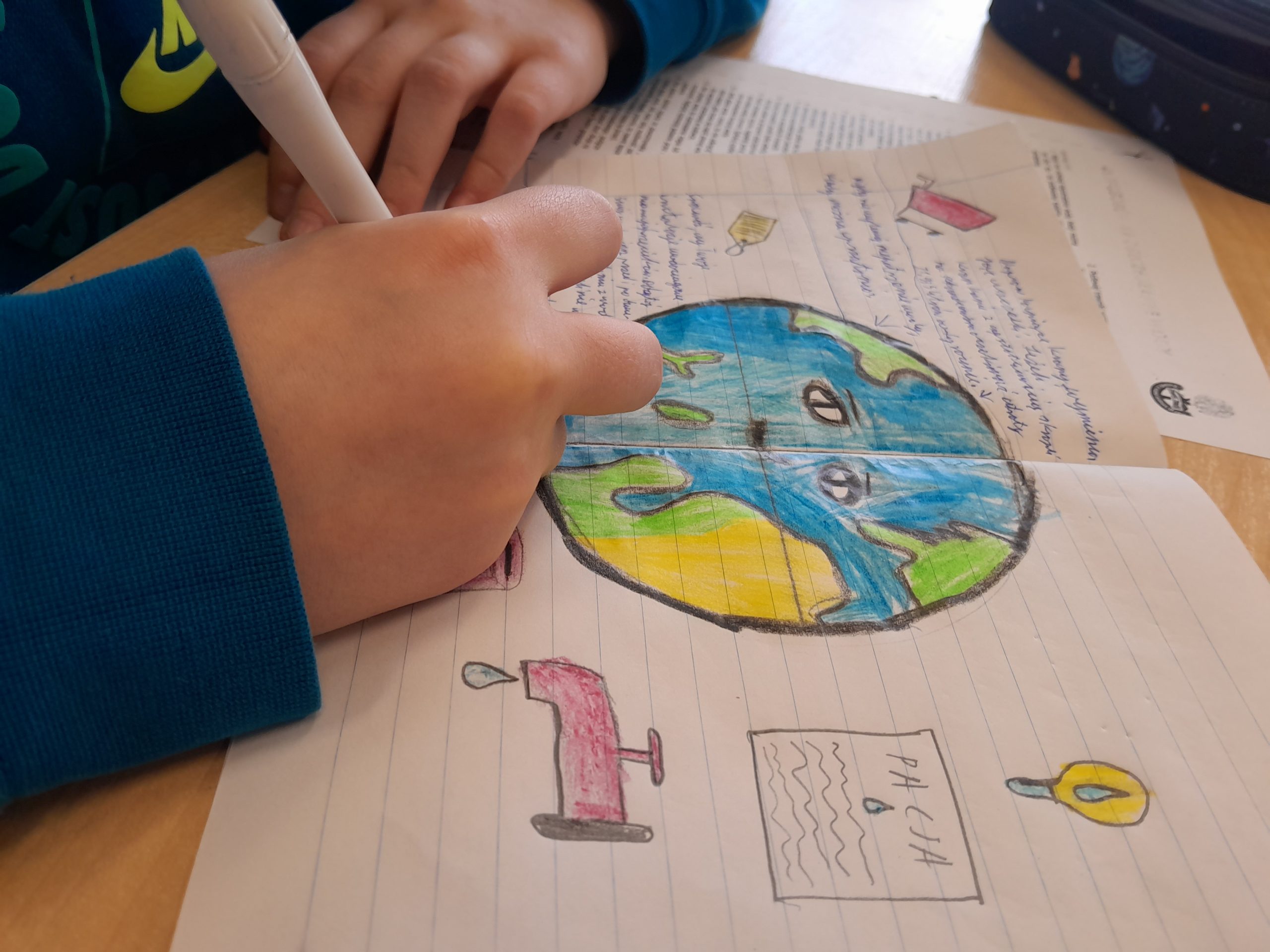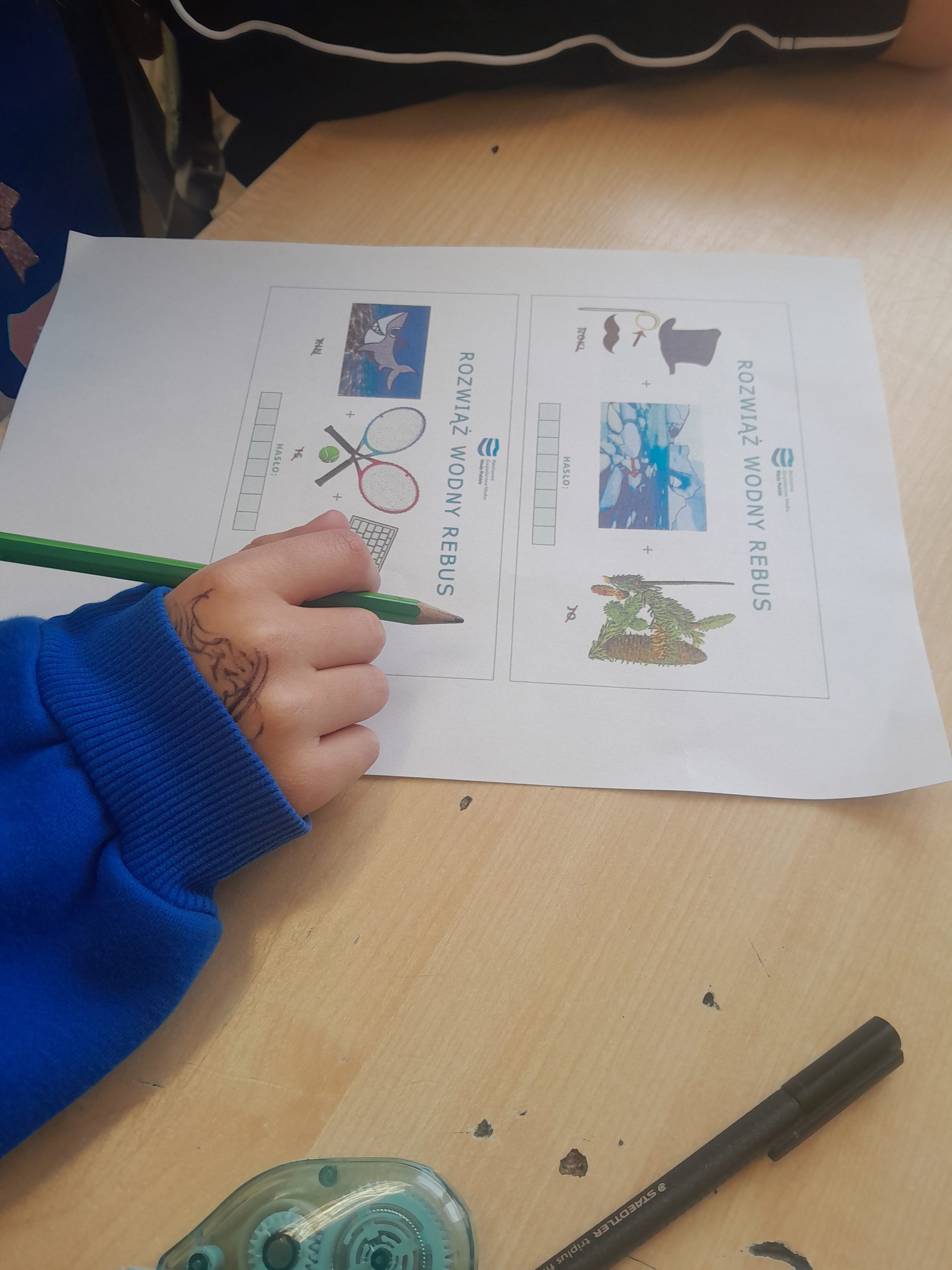 Uczniowie rozwiązywali także krzyżówki i rebusy związane z wodą, odkodowywali hasła tematyczne oraz sprawdzali swoją wiedzę, biorąc udział w quizach i testach. Podczas zajęć poznawali również praktyczne sposoby oszczędzania wody oraz dowiedzieli się, jak ich codzienne wybory wpływają na środowisko naturalne. Była to nie tylko ciekawa, ale i bardzo wartościowa lekcja odpowiedzialności za naszą planetę. W holu szkoły stanęła tablica z gazetką pt. Nie lejemy wody – oszczędzamy.